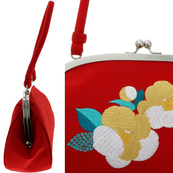 (卒業式応援75%SALE 2/19迄)刺繍がま口バッグ単品「赤色 椿」振袖バッグ 着物バッグ 刺繍バッグ 成人式の振袖に、卒業式に袴に 和装バッグ 【メール便不可】<H>