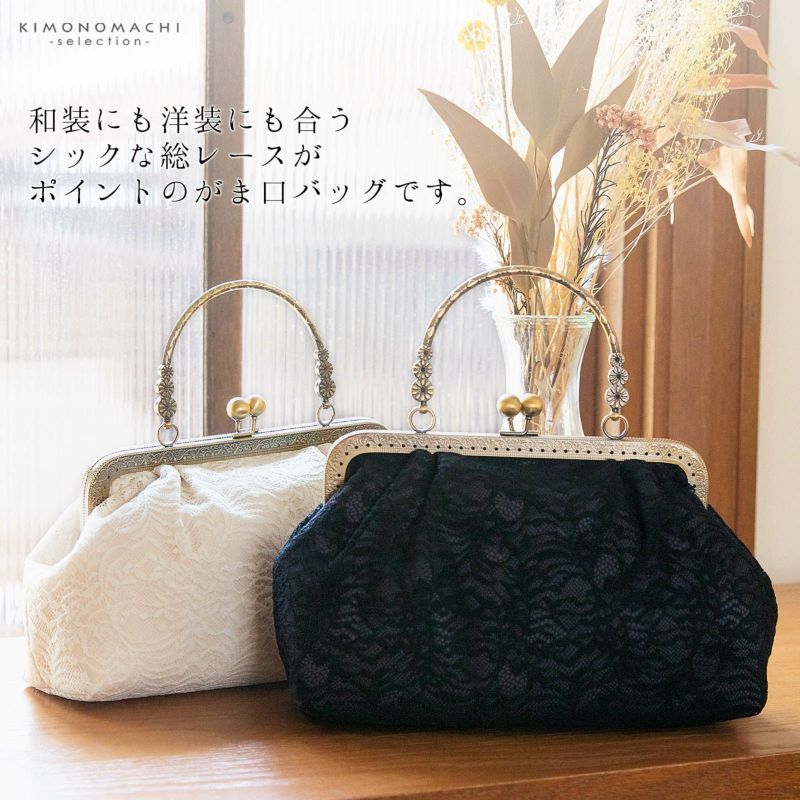 シックな総レースとアンティーク調の口金がかわいいがま口バッグです。クラシカルな雰囲気なので、袴やモダンな振袖スタイルにぴったり。もちろん普段使いもできますので、カジュアル着物や洋服、ワンピースなどにも合います。シンプルなデザインで、着物の柄を選ばずどんなスタイルにもおすすめです。
