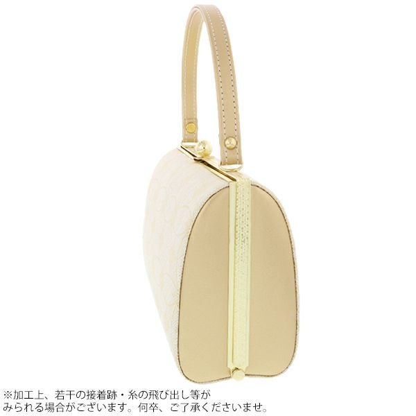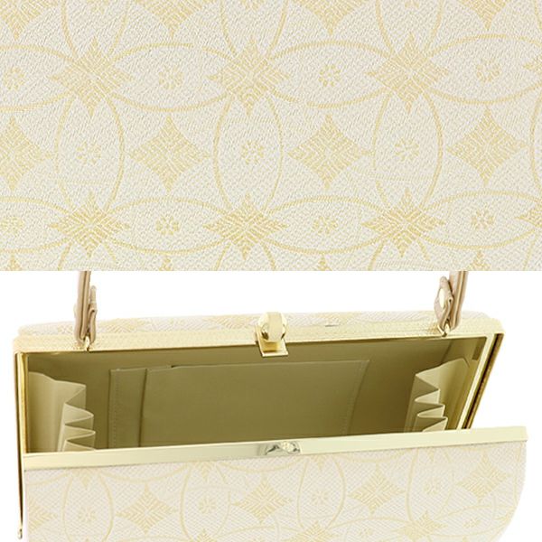 【カラー】バッグの表裏、草履の鼻緒は、金×生成りの輪繋ぎに菱文。バッグの側面、持ち手、草履の台は、艶消しのような落ち着いた色めのゴールド。