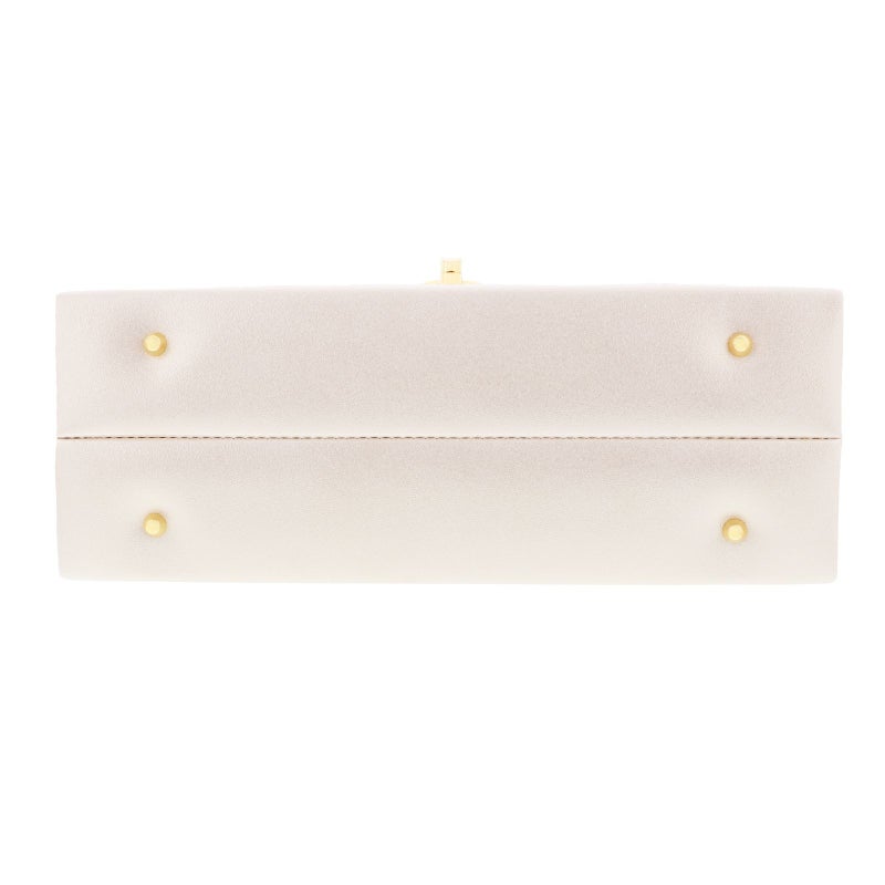 バッグの蓋と持ち手、草履の鼻緒と芯の巻きは、ごく淡い生成り色の地に金のマーブル模様。淡く虹色の光沢があり、上品な高級感。バッグの口金は金。バッグの受け、草履の台は、梨地のような細かな金の輝きのある淡いグレーベージュ。