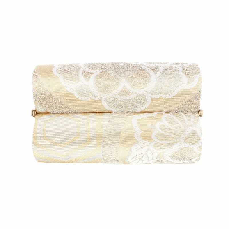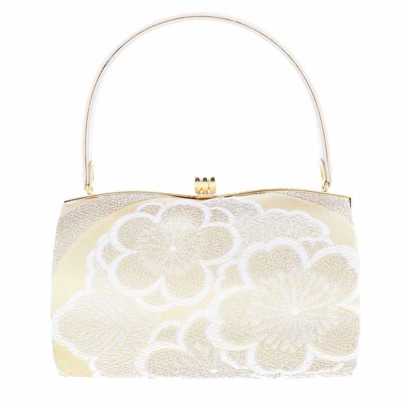 【色柄】バッグの本体は、ベージュゴールド地に白、シルバーを基調とした、丸に梅や桜、菊などの花紋、亀甲文様。持ち手、側面は白地にアイボリー。口金はゴールド。草履の鼻緒はバッグと共生地。草履の台はプラチナゴールド。