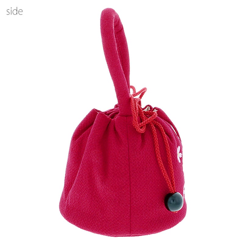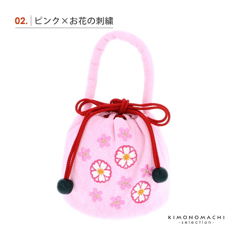 ちりめん生地のお花の刺繍が可愛らしいお子様用の巾着です。丸みのある持ち手、巾着のフォルムが女の子らしい可愛い雰囲気。七五三にはもちろん、お正月や桃の節句などお着物に合わせて。