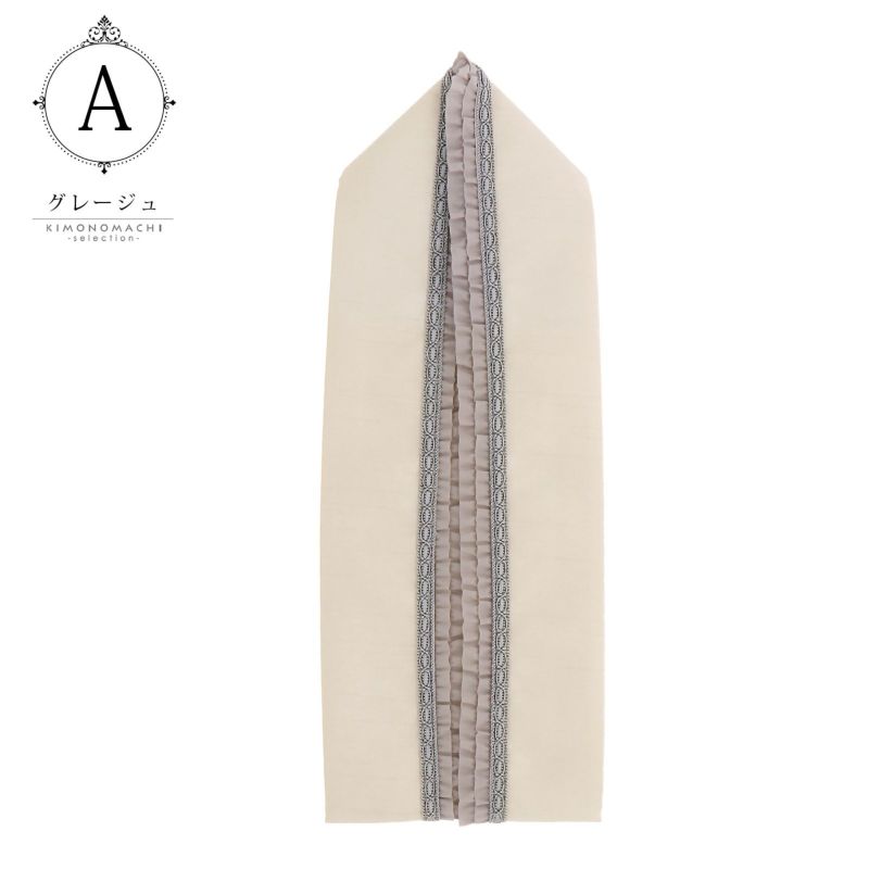 A.グレージュ…グレイッシュなベージュのシャンタン風の重ね衿、縁にグレーのブレードレース、グレージュのダブルフリル。