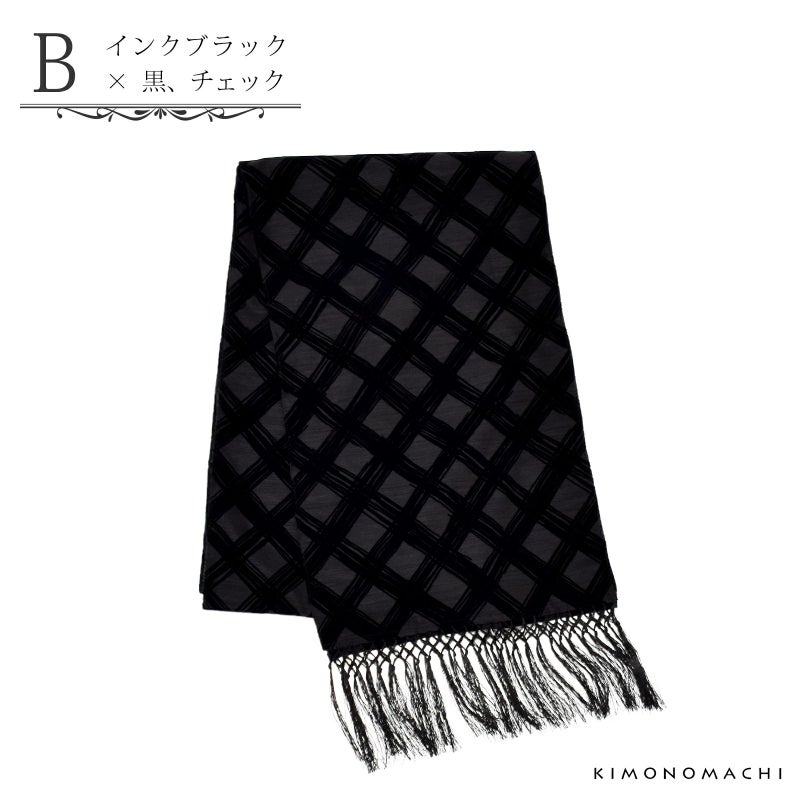 B.インクブラック×黒、チェック…横に筋糸のはいったグレイッシュな黒の地にベルベット調の質感の黒のチェック。房は黒。