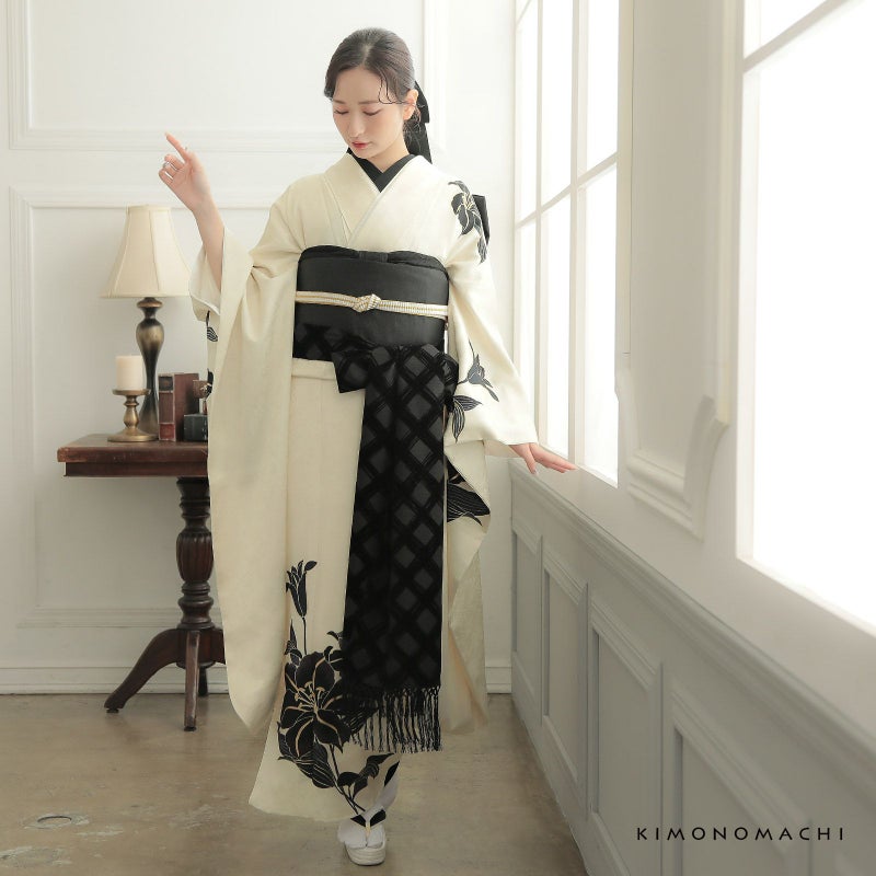 しごき 振袖用 「アイボリー×黒、チェック・インクブラック×黒、チェック」 志古貴 豪華 おしゃれ お洒落 成人式 結婚式 振袖 振袖用 ママ振袖 着物 振袖小物 日本製 【メール便不可】