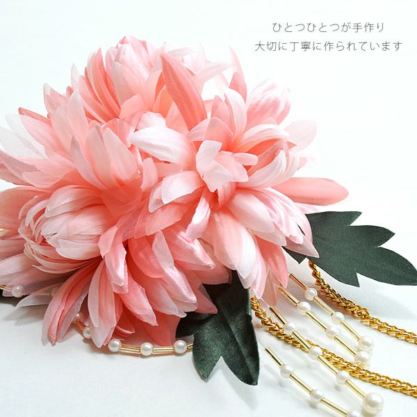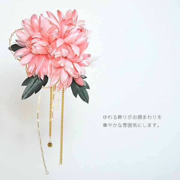 お花に、チェーン、ビーズの下がり飾りは華やかな。現代柄のお着物にも、古典柄などのちょっとレトロな雰囲気のお着物にも合わせていただけます。