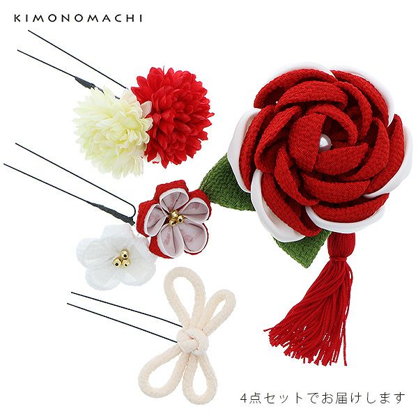 【Prices down3】振袖髪飾り4点セット「赤色のふっくらつまみのお花、紐飾り、房飾り」つまみ細工かんざし 成人式の振袖、卒業式の袴にも 前撮り、成人式、結婚式の振袖に お花髪飾り (3836)【メール便不可】ss2509wkk15