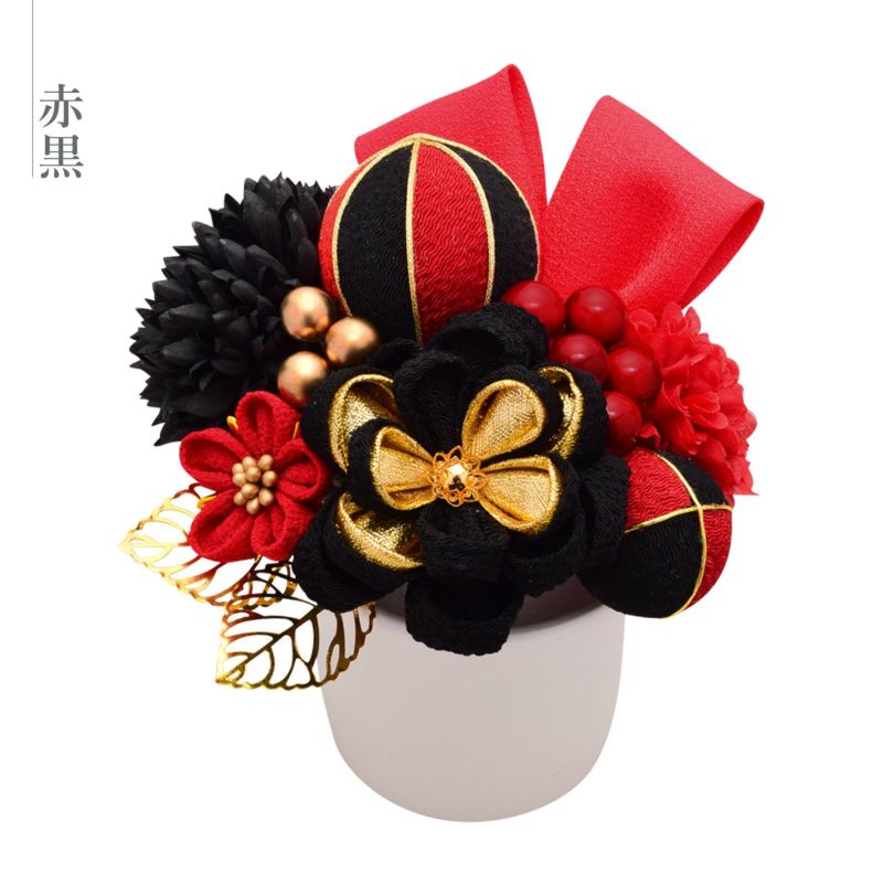 赤黒:くっきりとした赤のリボン飾り。つまみのお花・大は黒にゴールド、花芯もゴールド。つまみの小は深い赤にブロンズの花芯。ポンポンマムのような造花は、大が黒色、中が暗赤色の各1点。玉飾り大小は黒に明るい赤、深い赤を組み合わせ、金糸の縁取りがあります。ゴールドの透かしの葉が2点。ビーズ飾りはつやのある濃赤色とブロンズを組み合わせたもの、ブロンズビーズが1点ずつ。
