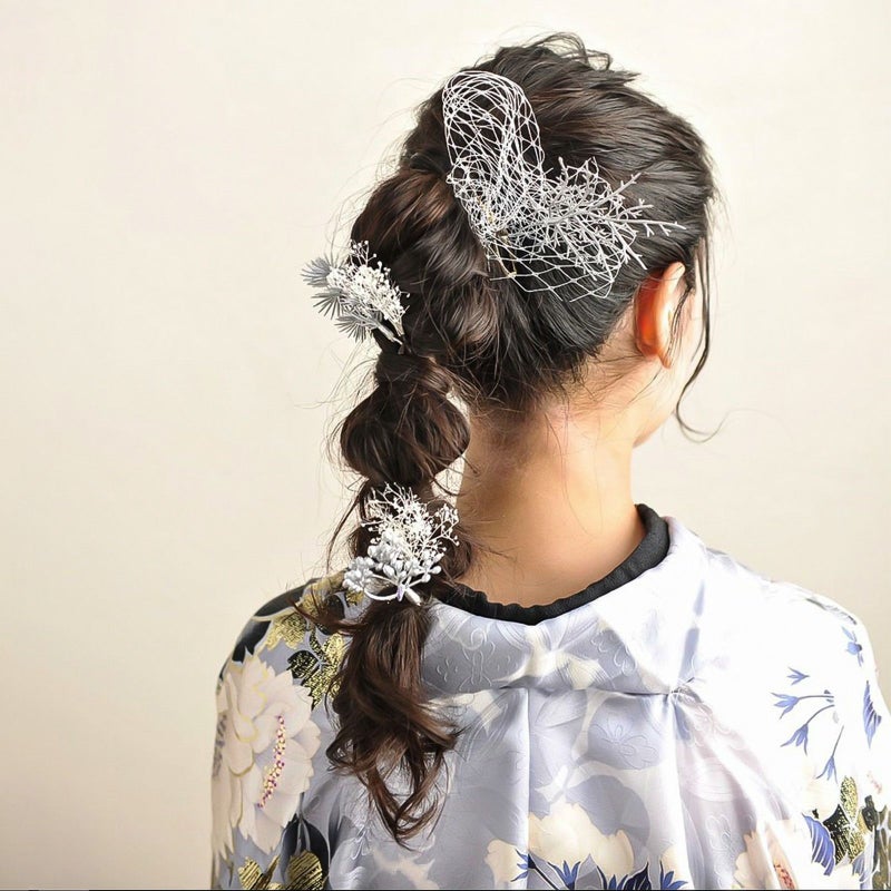 【カラー】白のカスミソウのUピン3点、シルバーの花芽のUピン1点、枝飾りのUピン1点、シルバーラメのネットリボンのUピン1点。きれいなデザインの化粧箱入り。