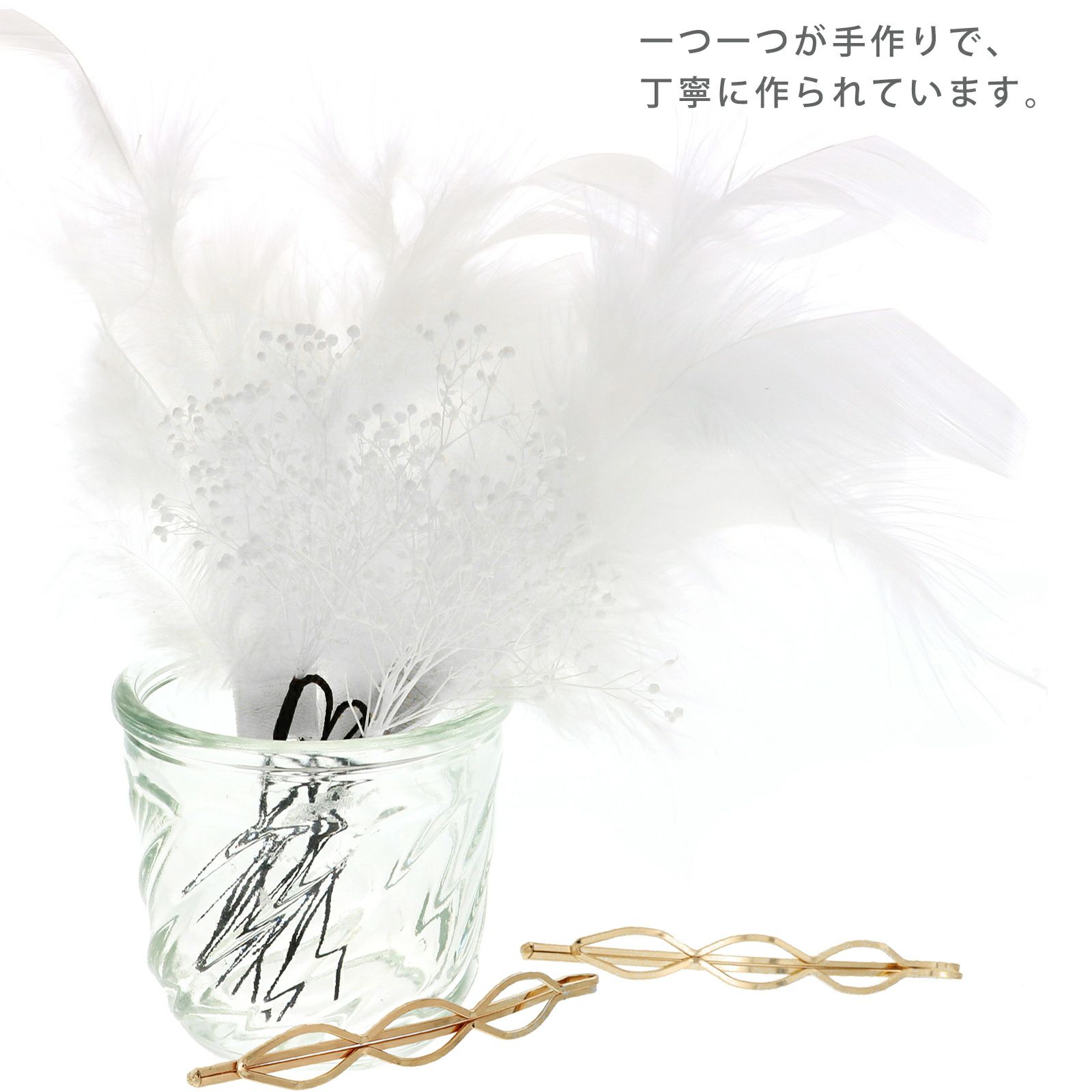 【カラー】白い羽根飾りのUピン3点、カスミソウのUピン2点、ゴールドの波型のヘアピン2点。楽しいデザインの化粧箱入り。