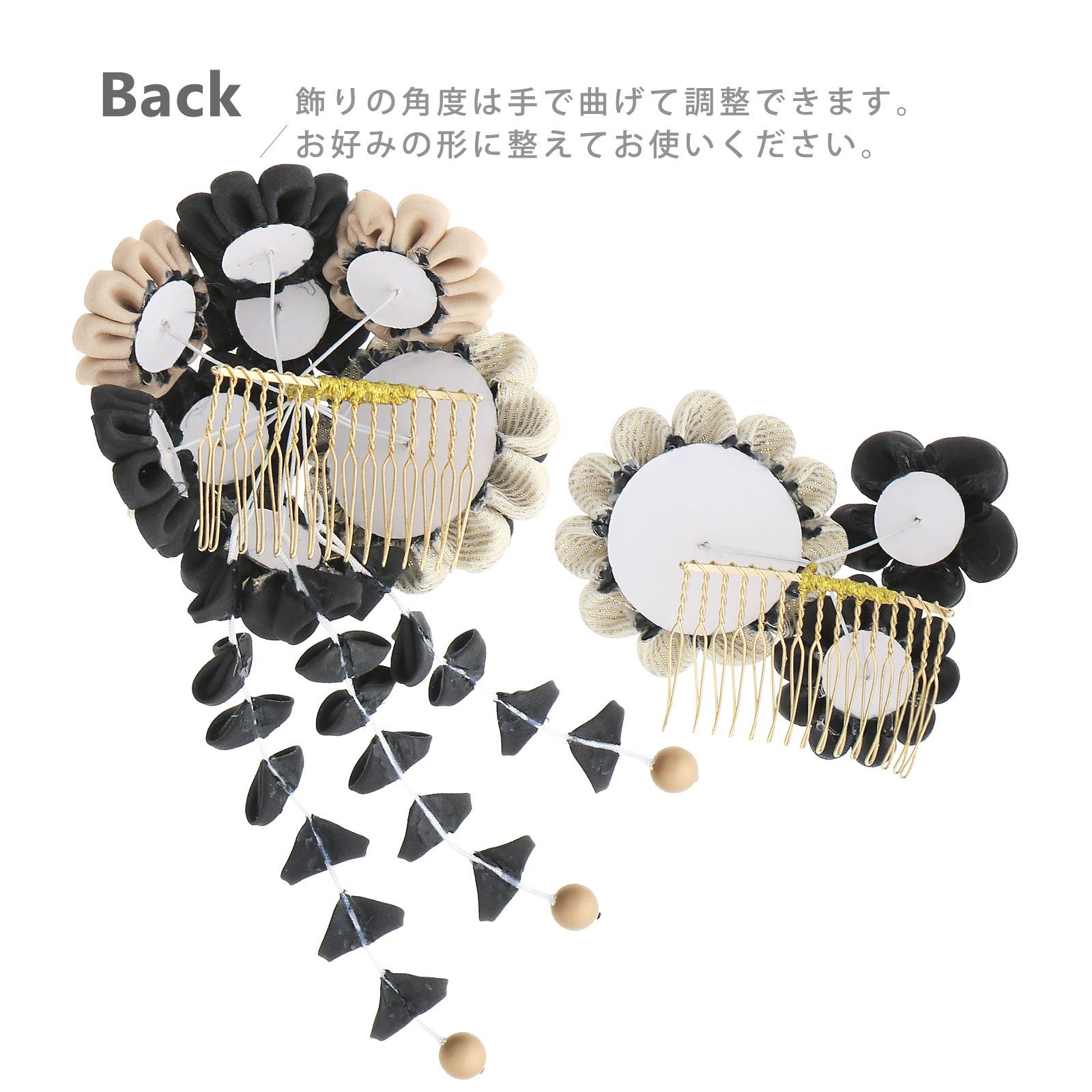 1ブラック×ベージュ・・・黒とゴールドラメ、黒とベージュの丸つまみに白のペップの八重菊や梅を組み合わせた花飾り、房下がりは白の紐に黒のつまみの花びら、先端にマットなブロンズビーズ。黒とゴールドラメの八重菊と梅。