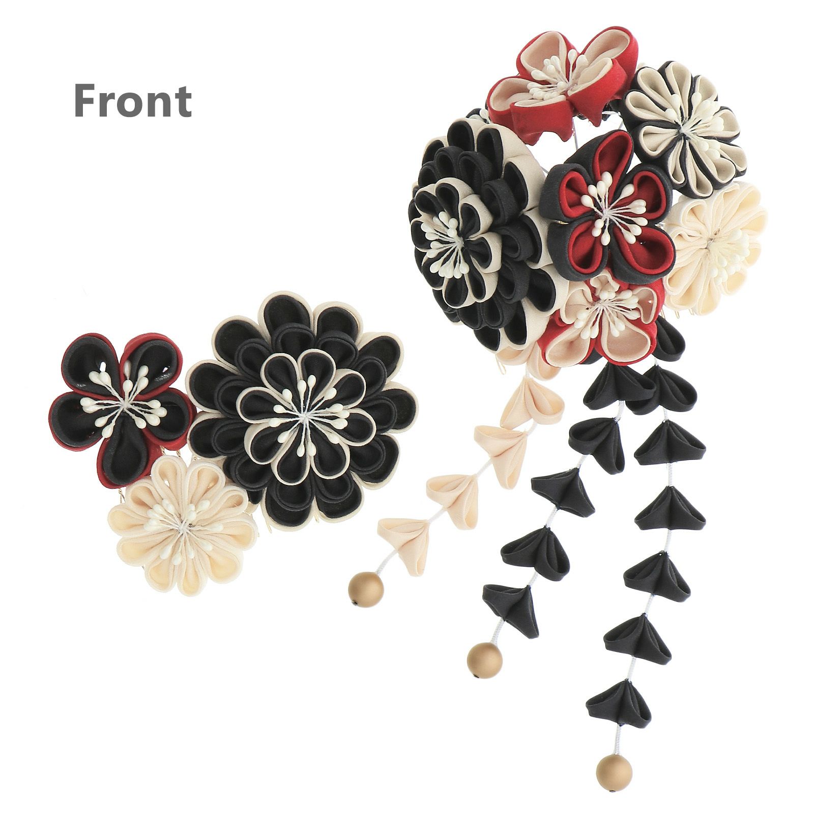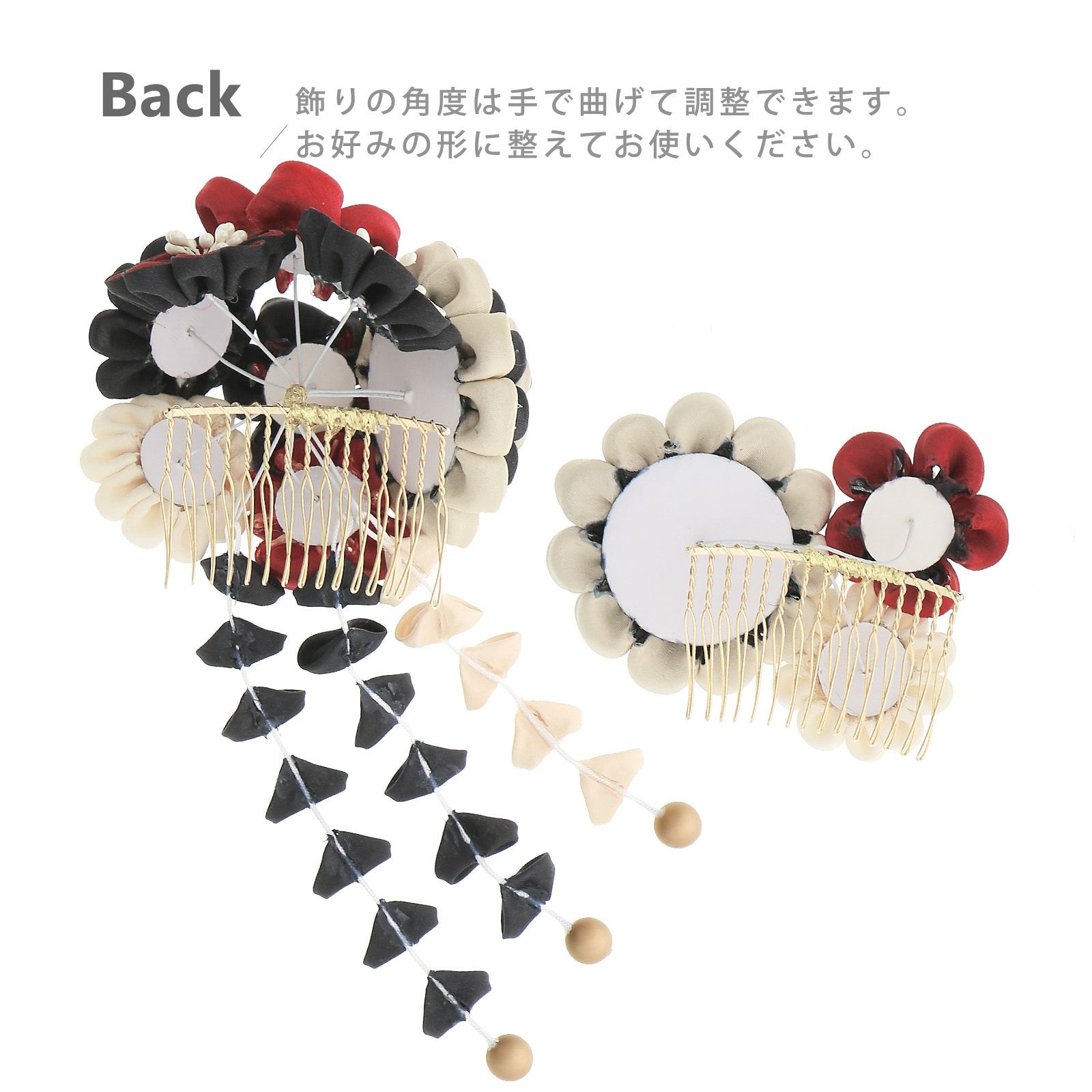 2ブラック×レッド×ベージュ・・・黒と赤、ベージュの丸つまみに白のペップの八重菊や梅を組み合わせた花飾り、房下がりは白の紐に黒のつまみの花びら、ベージュの花びら、先端にマットなブロンズビーズ。黒とベージュの八重菊と黒と赤、ベージュの梅。