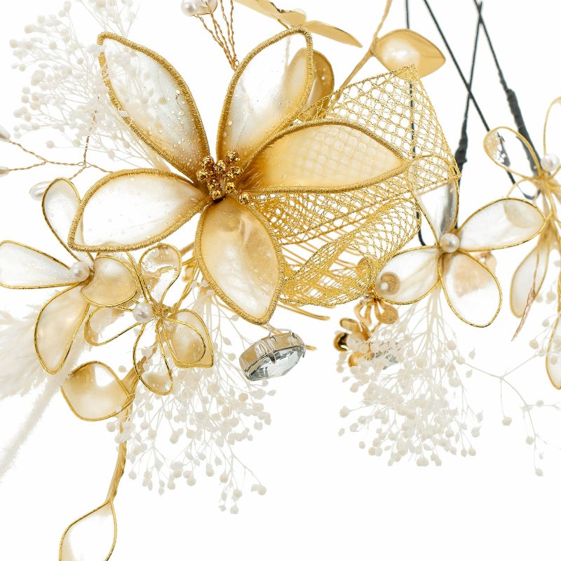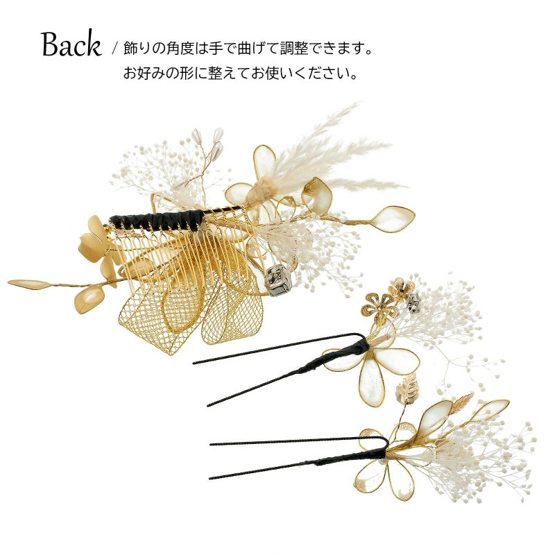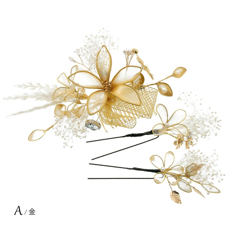 A.金:ゴールドのワイヤーに半透明のゴールドや白の樹脂の膜を張ったディップフラワー、白のプリザーブドフラワーのカスミソウや穂、ゴールドのメタルフラワー、パールビーズやラインストーン、金のチュールリボンを組み合わせたコーム1点。ディップフラワーにカスミソウ、メタルパーツの花や葉を組み合わせたUピン2点。