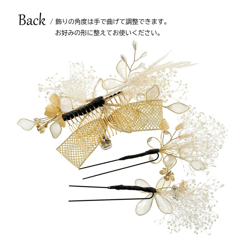 B.白:ゴールドのワイヤーに半透明の白や透明の樹脂の膜を張ったディップフラワー、白のプリザーブドフラワーのカスミソウや穂、ゴールドのメタルフラワー、パールビーズやラインストーン、金のチュールリボンを組み合わせたコーム1点。ディップフラワーにカスミソウ、メタルパーツの花や葉を組み合わせたUピン2点。