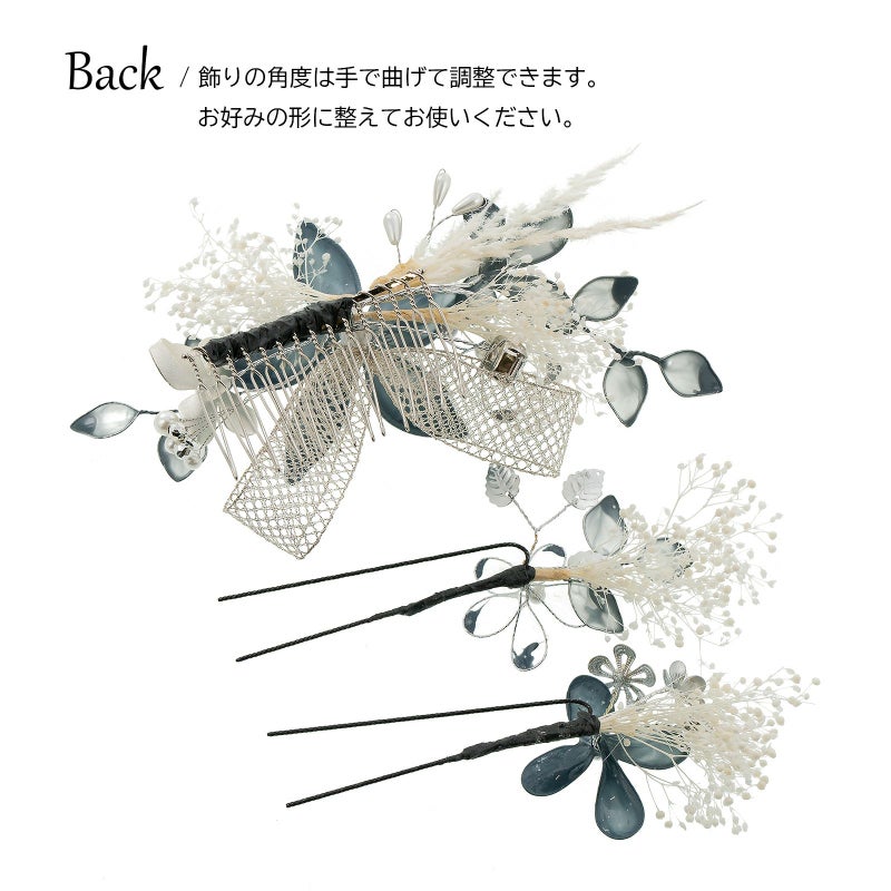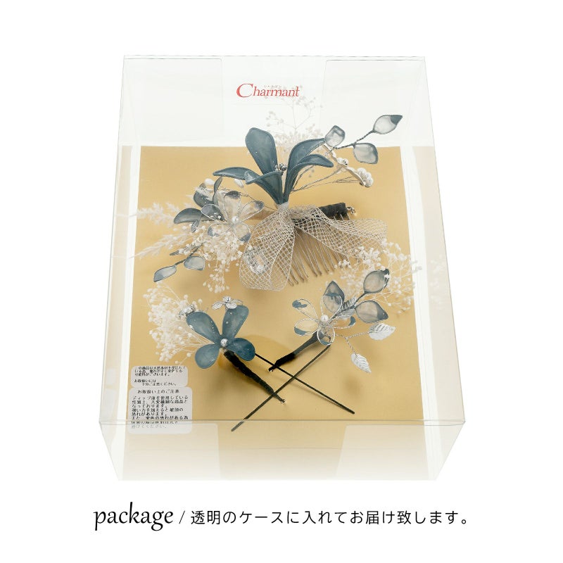 C.青灰色:ゴールドのワイヤーにブルーグレーや透明の樹脂の膜を張ったディップフラワー、白のプリザーブドフラワーのカスミソウや穂、シルバーのメタルフラワー、パールビーズやラインストーン、銀のチュールリボンを組み合わせたコーム1点。ディップフラワーにカスミソウ、メタルパーツの花や葉を組み合わせたUピン2点。