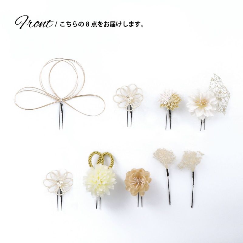 (卒業式応援75%SALE 2/19迄)成人式 髪飾り 卒業式 Uピンの8点セット「マムに綱飾り、カメリア、カスミソウ 白」日本製 水引き Uピン 振袖用髪飾り 結婚式 前撮り 後撮り 着物【メール便不可】