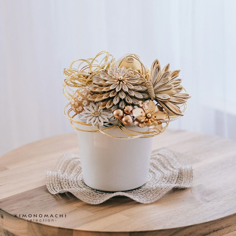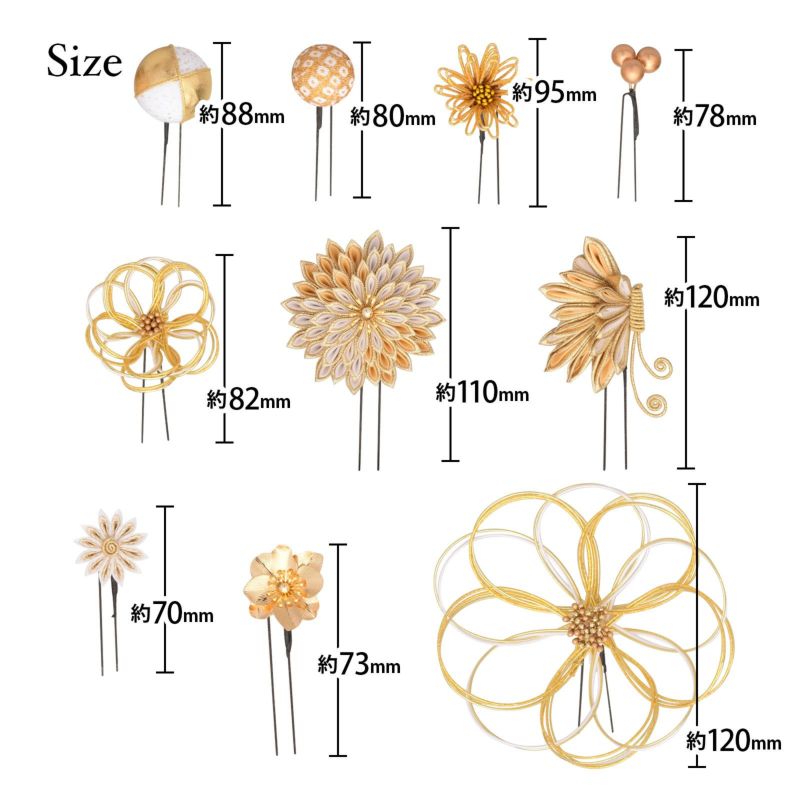 1.金:ゴールド、イエローゴールド、白の水引の輪にゴールドのペップのお花・特大1点。同・小1点。白とゴールド、ベージュとゴールドの二重剣つまみのむじな菊1点。白、ベージュ、ゴールドのつまみの蝶1点。白とゴールドラメの剣つまみの小菊1点。ゴールドのメタルフラワー1点。ゴールドと白縮緬を組み合わせた玉飾り1点。白とゴールドの鹿の子の玉飾り1点。イエローゴールドの水引の菊の花1点。ブロンズビーズの実の飾り1点。