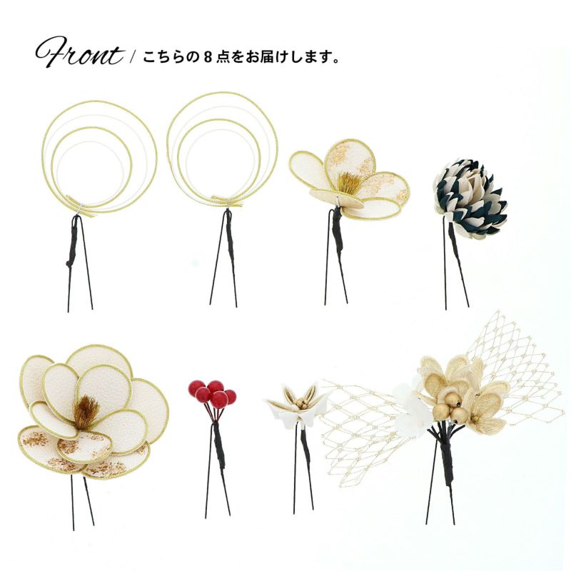 2アイボリー ねじ花、水引:アイボリーに金箔の入った縮緬地にゴールドの縁取りの平たい花びらのねじ花大小各1点。深緑とベージュの花びらのマムUピン1点。ゴールドと白の小花にゴールドビーズとチュールリボンを組み合わせたUピン1点。アイボリーとゴールドの二重剣つまみのお花のUピン1点。赤い実のUピン1点。アイボリーとゴールドの水引の輪飾り2点。
