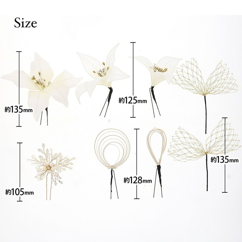 【色柄】ゴールドやラインストーンの蕊が輝くアイボリーの百合の花1点。透け感のあるアイボリーの百合の花2点。パールビーズにラインストーンの花、ゴールドの枝に透明なカットビーズを組み合わせたかんざし1点。ゴールドのチュールリボンのUピン2点。白とゴールドの水引の輪飾りUピン1点。コットンパールを通した白、金、銀の水引飾りUピン1点。
