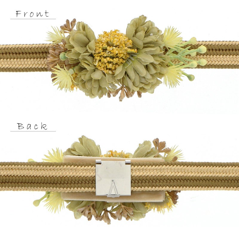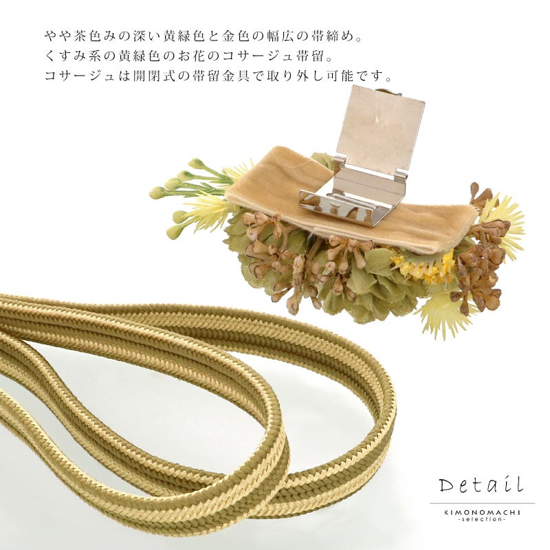帯締め 振袖用 帯〆 正絹 「鶯色×金、黄緑色のコサージュ付き」 日本製 豪華 おしゃれ お洒落 くすみカラー ダスティカラー ニュアンスカラー 組紐 くみひも 組みひも 金糸 成人式 結婚式 振袖 正絹帯締め 振袖用帯締め 着物 振袖小物 【メール便不可】