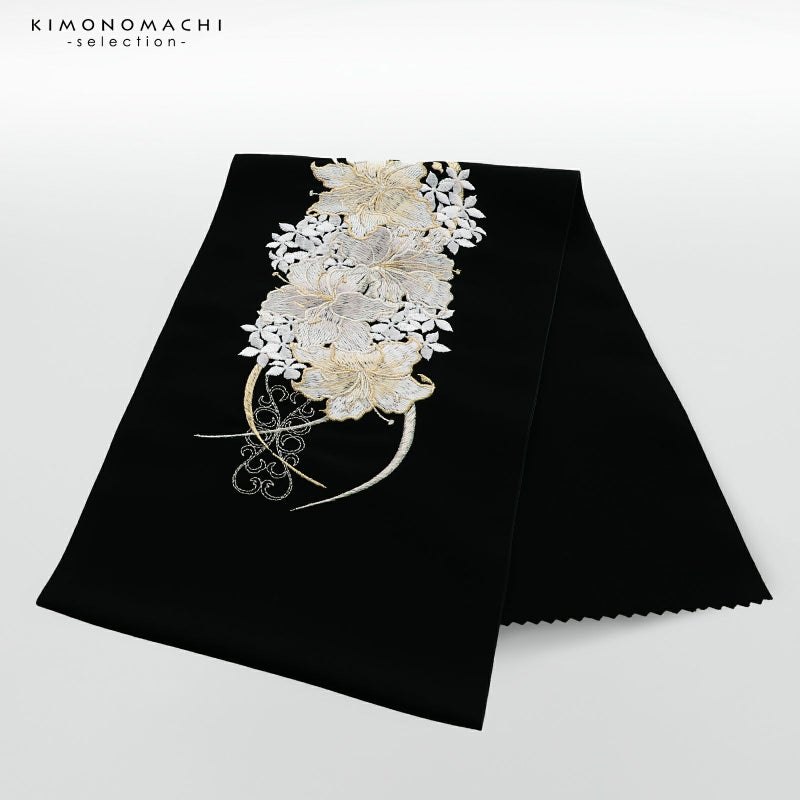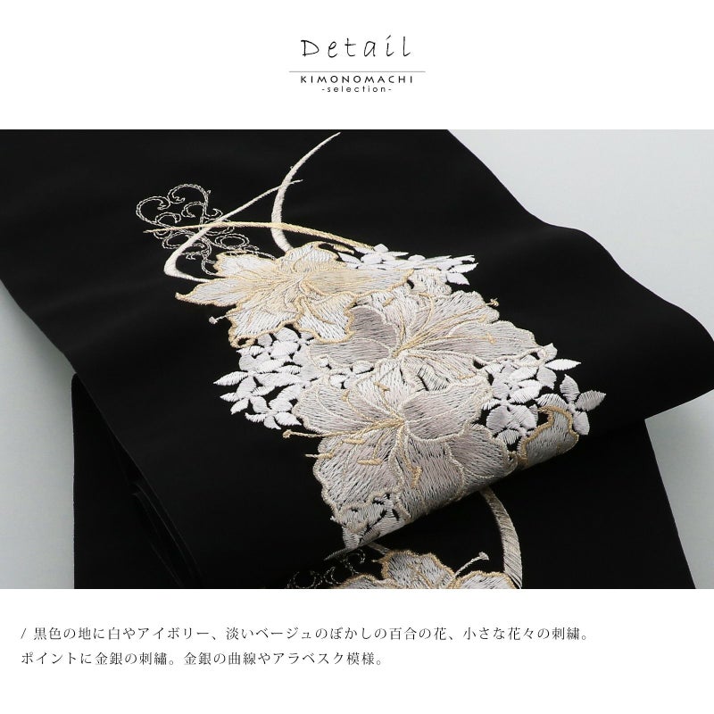 【色柄】黒色の地に白やアイボリー、淡いベージュのぼかしの百合の花、小さな花々の刺繍。ポイントに金銀の刺?。金銀の曲線やアラベスク模様。
