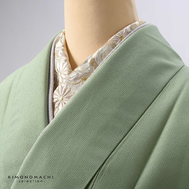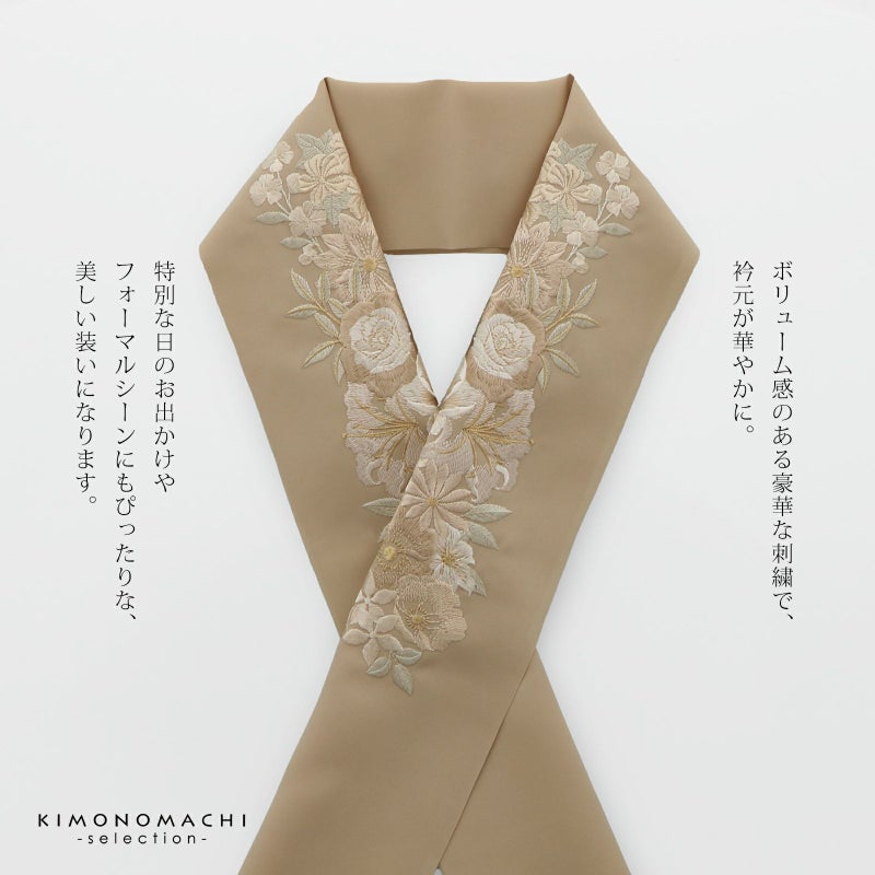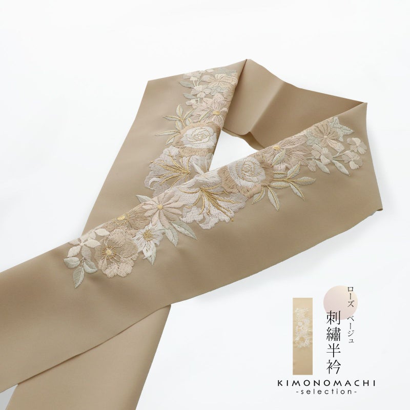 半衿自体のおしゃれに加えて、長襦袢の襟元の汚れを防ぐ役割と、着付けを美しく見せる役割も担っています。