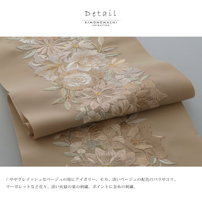 【色柄】ややグレイッシュなベージュの地にアイボリー、モカ、淡いベージュの配色のバラやユリ、マーガレットなど花々、淡い灰緑の葉の刺繍。ポイントに金糸の刺繍。