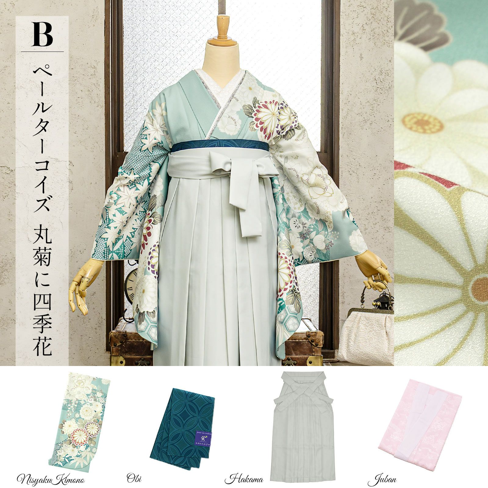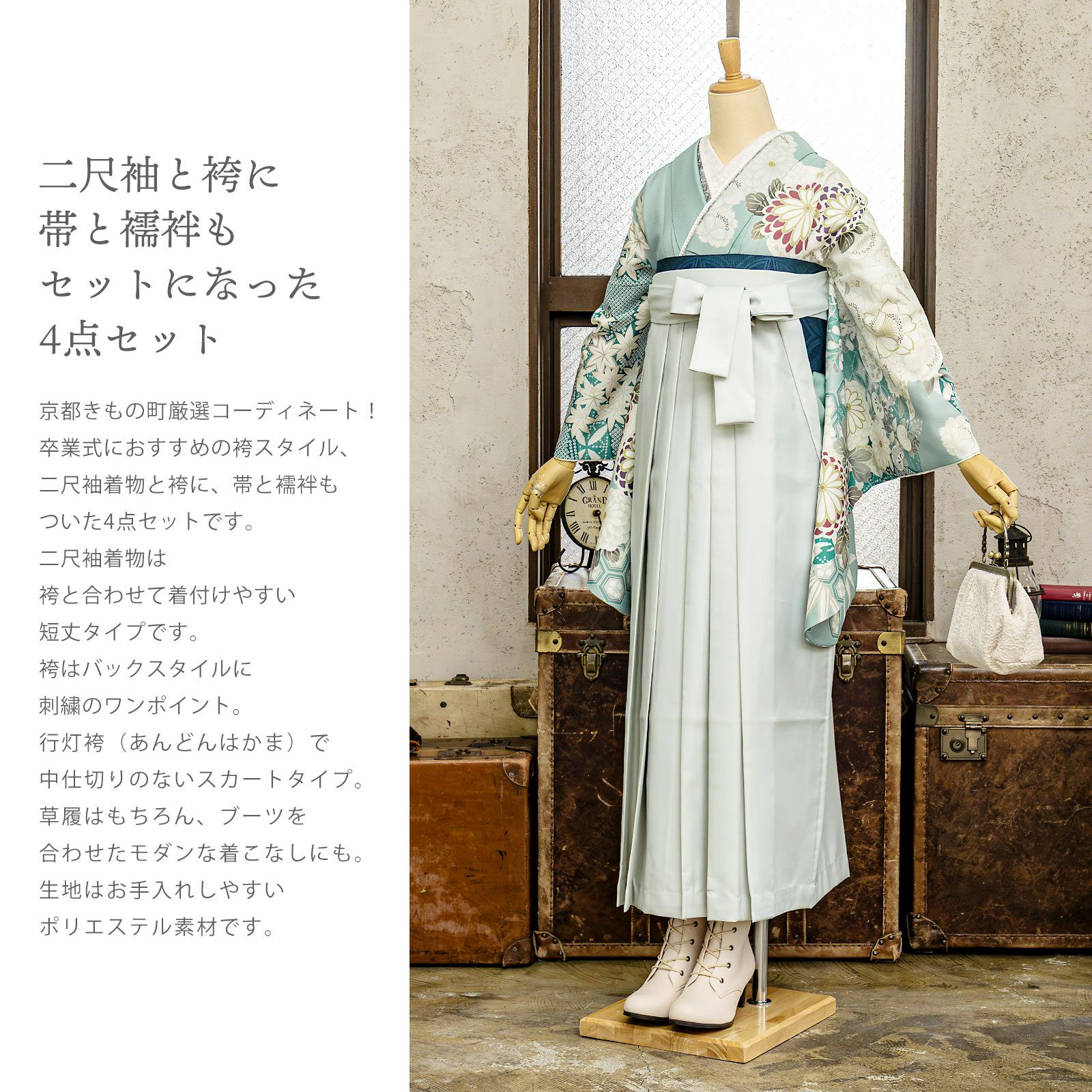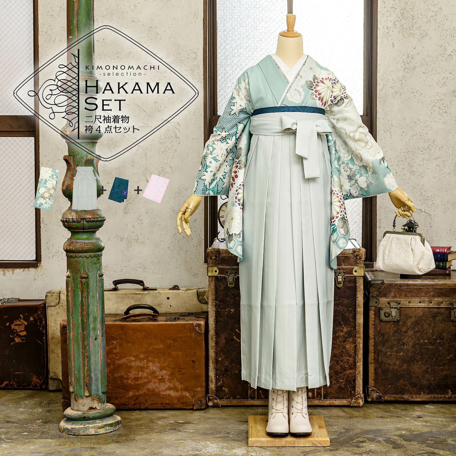 他の画像を見る 送料無料 卒業式に 二尺袖袴セット 卒業式 袴 レディース 袴 セット 卒業式 女性 4点セット「二尺袖:ペールターコイズ 丸菊に四季花+袴 アイスグレー椿:+袴下帯:テールグリーン 七宝+襦袢」SS/S/M/L/LL サイズ 卒業式 女性 レディース お仕立て上がり 袴セット 二尺袖着物セット 着物 二尺着物 袴【メール便不可】 きもの町価格 ¥ 94,050 税込 カートに入れる お気に入りに登録する
