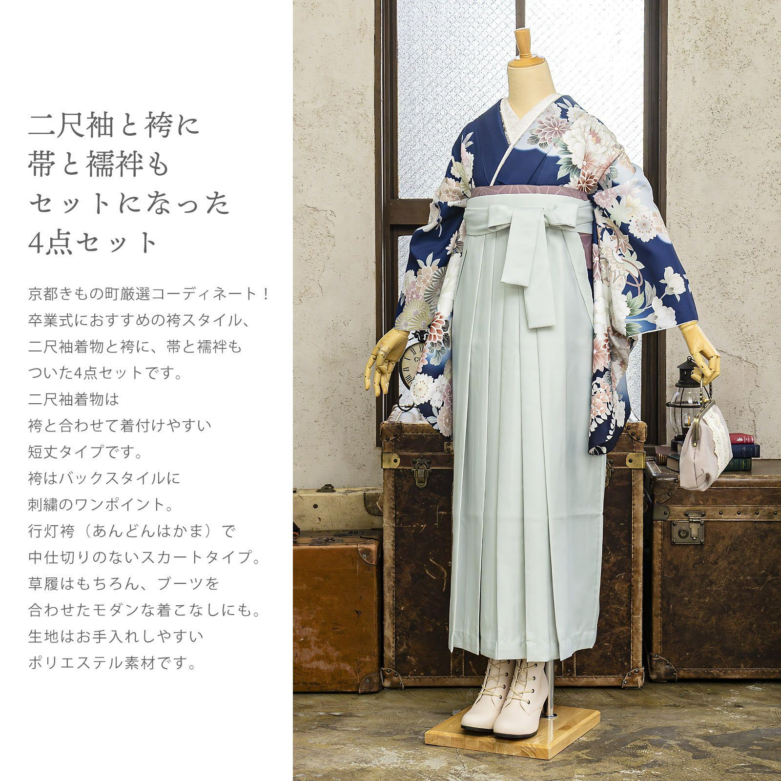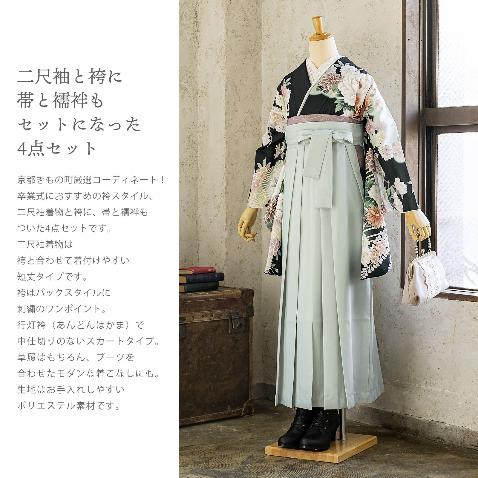 他の画像を見る 送料無料 訪問着と袴に、帯と襦袢を合わせた先生袴4点セット (卒業式応援75%SALE 3/5迄)先生袴 セット 4点セット「JAPAN STYLE 訪問着+袴+袴下帯+襦袢」卒業式 女性 レディース お仕立て上がり 袴セット 訪問着セット 着物 訪問着 袴 先生【メール便不可】 通常販売価格 ¥ 104,830 のところ きもの町価格 ¥ 101,530 税込 販売期間 2026/02/19 18:00 〜 2026/03/05 17:59 カートに入れる お気に入りに登録する