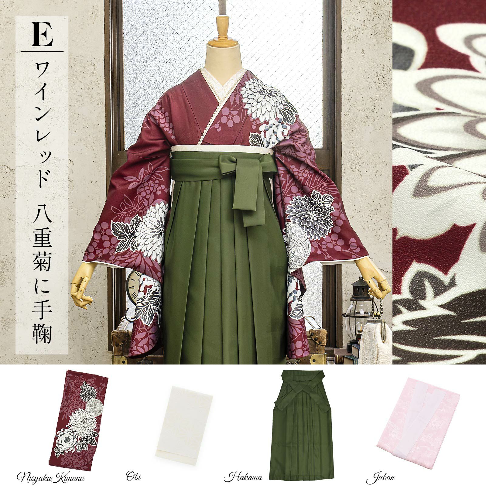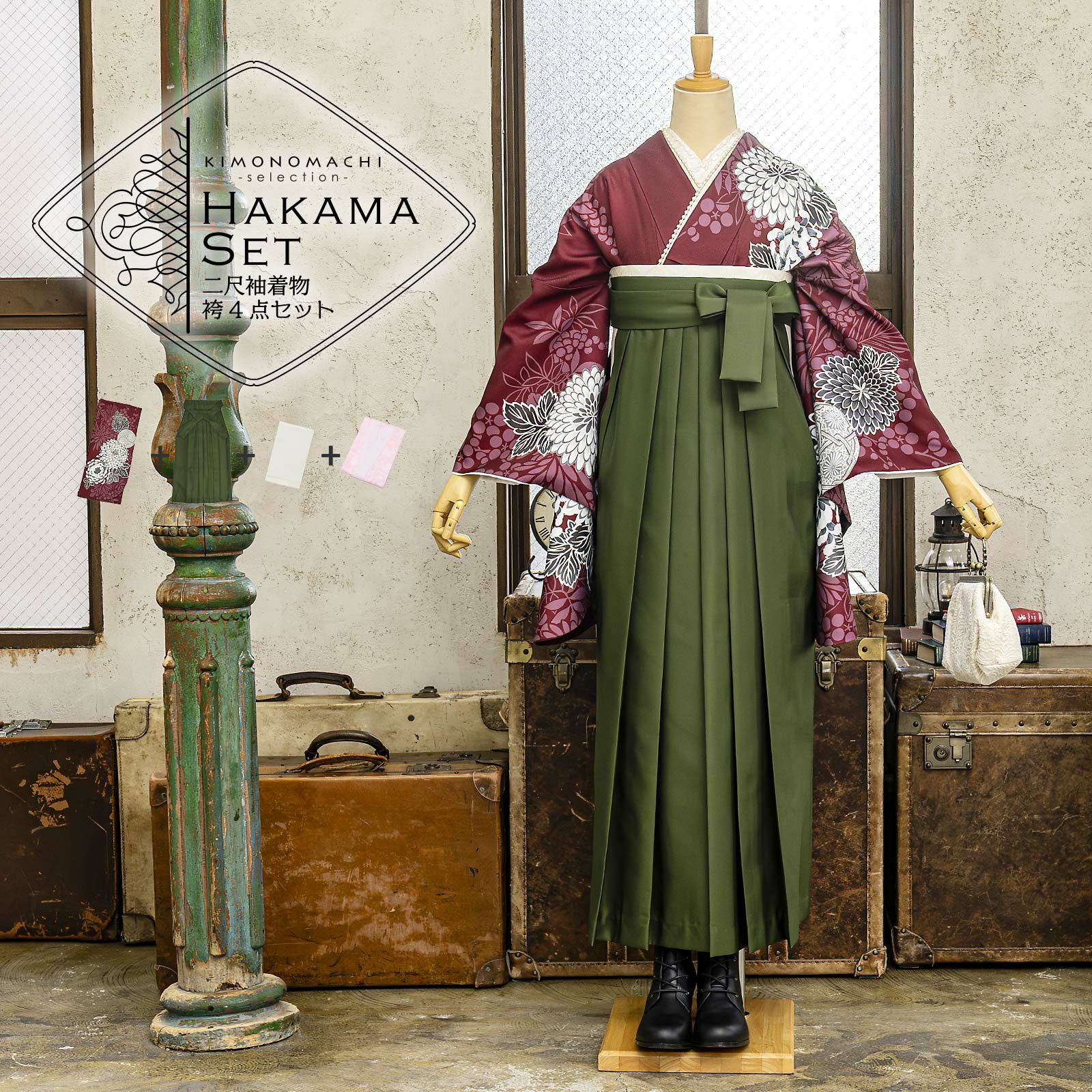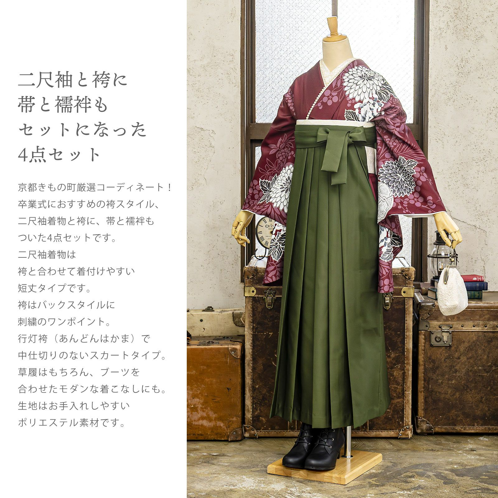 他の画像を見る 送料無料 卒業式に 二尺袖袴セット 卒業式 袴 レディース 袴 セット 卒業式 女性 4点セット「二尺袖:ワインレッド 八重菊に手鞠+袴:抹茶 椿+袴下帯:麻の葉 白+襦袢」3S/SS/S/M/L/LL サイズ 卒業式 女性 レディース お仕立て上がり 袴セット 二尺袖着物セット 着物 二尺着物 袴【メール便不可】 きもの町価格 ¥ 94,050 税込 カートに入れる お気に入りに登録する