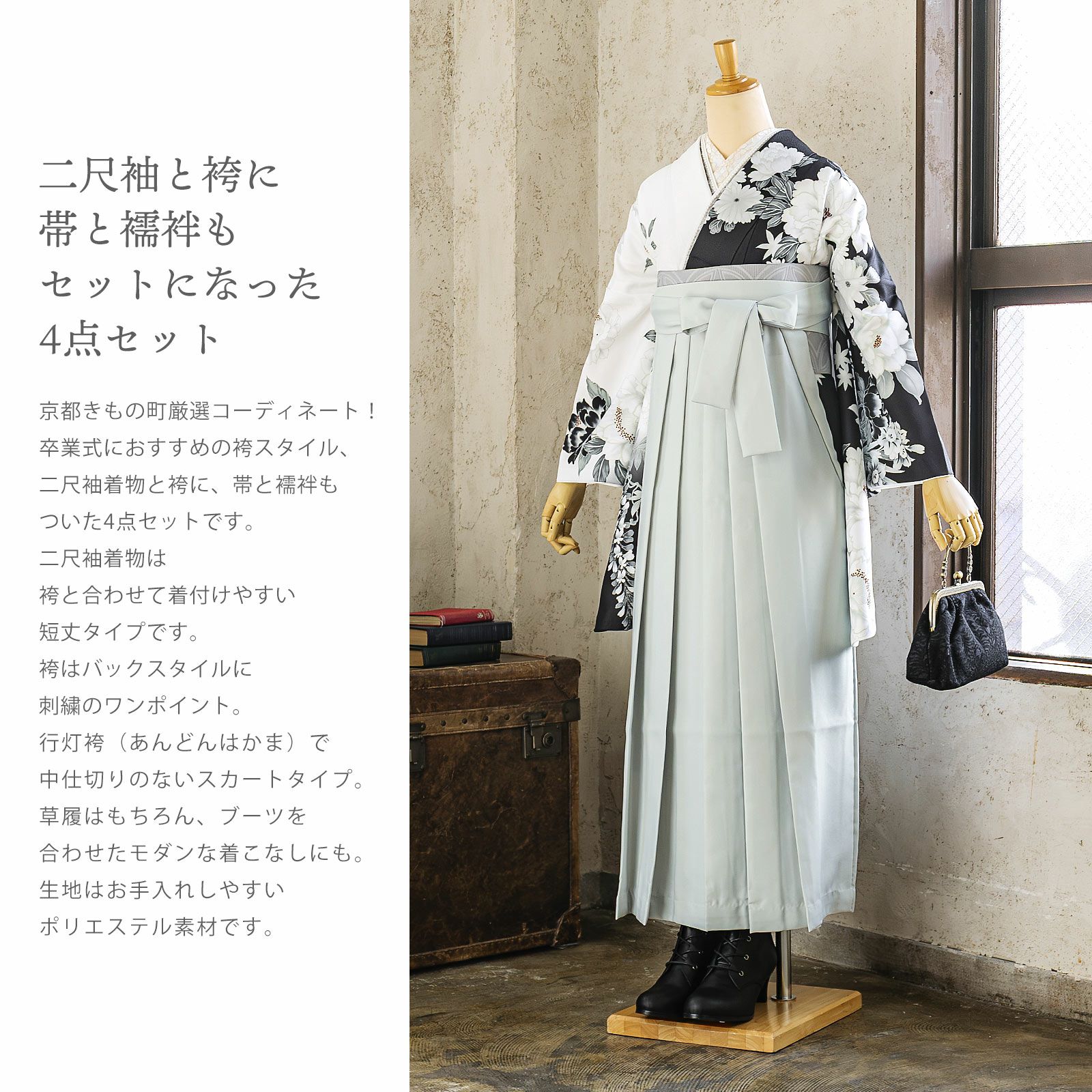 他の画像を見る 送料無料 卒業式に 二尺袖袴セット 卒業式 袴 レディース 袴 セット 卒業式 女性 4点セット「二尺袖:黒×白 牡丹に四季花+袴 アイスグレー椿:+袴下帯:シルバーグレー 七宝+襦袢」SS/S/M/L/LL サイズ 卒業式 女性 レディース お仕立て上がり 袴セット 二尺袖着物セット 着物 二尺着物 袴【メール便不可】 きもの町価格 ¥ 94,050 税込 カートに入れる お気に入りに登録する