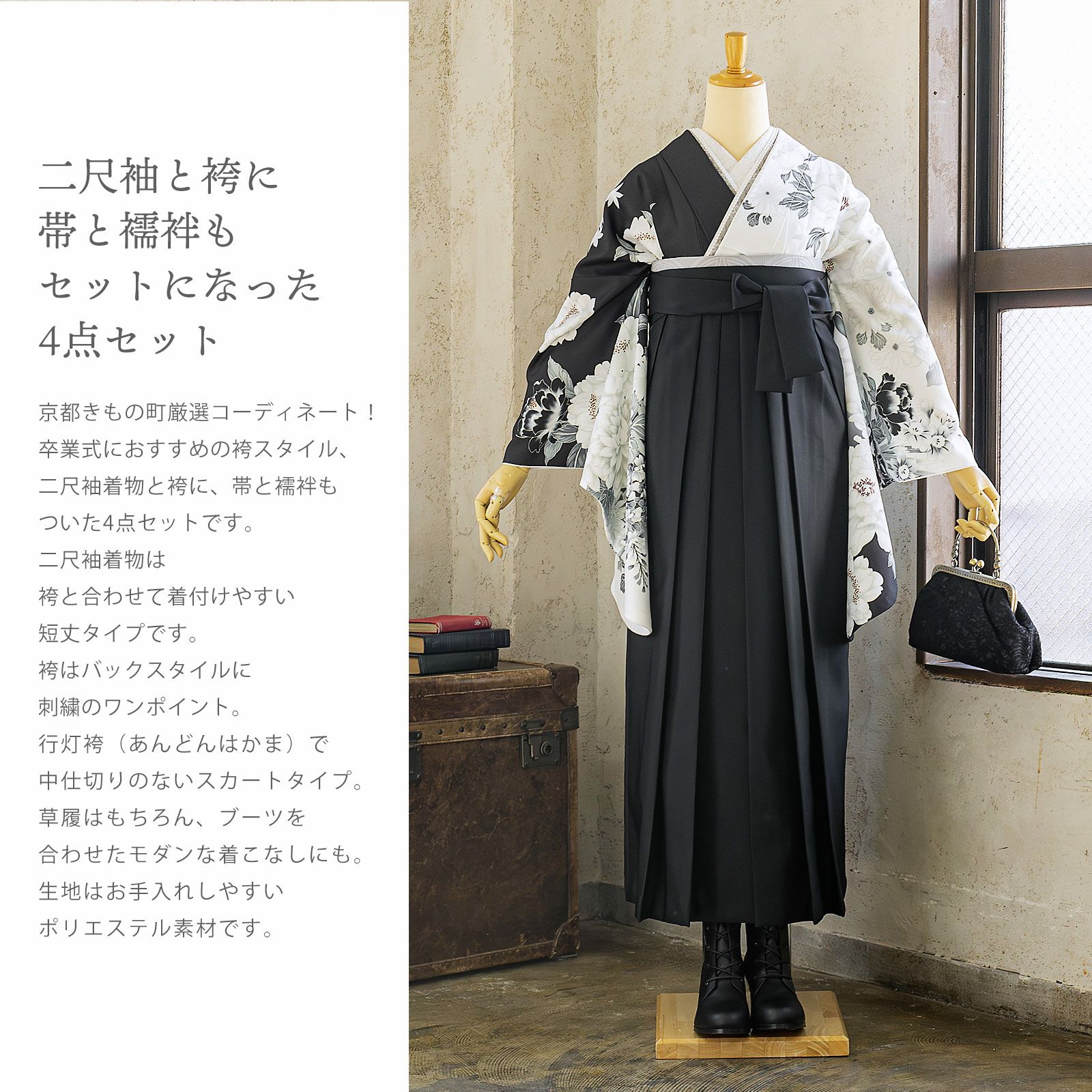 他の画像を見る 送料無料 卒業式に 二尺袖袴セット 卒業式 袴 レディース 袴 セット 卒業式 女性 4点セット「二尺袖:白×黒 牡丹に四季花+袴:黒 椿+袴下帯: シルバーグレー 七宝+襦袢」SS/S/M/L/LL サイズ 卒業式 女性 レディース お仕立て上がり 袴セット 二尺袖着物セット 着物 二尺着物 袴【メール便不可】 きもの町価格 ¥ 94,050 税込 カートに入れる お気に入りに登録する