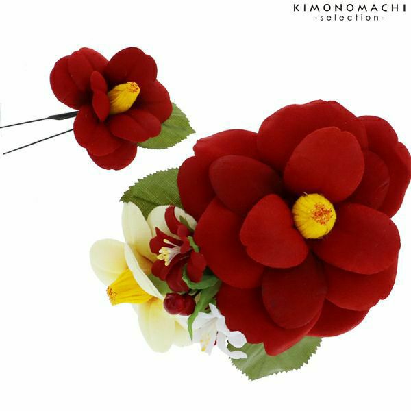 華やかな椿のお花のコーム、Uピンの髪飾り2点セットです。振袖などの華やかなお着物に合わせて、成人式、結婚式などの晴れやかな席に。