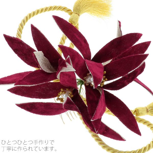 【Prices down3】振袖、袴髪飾り「エンジ色のお花と金色の組紐、房飾り」お花髪飾り ベロア 振袖髪飾り 成人式、結婚式 ベルベット (4070)【メール便不可】<H>ss2512wkk40