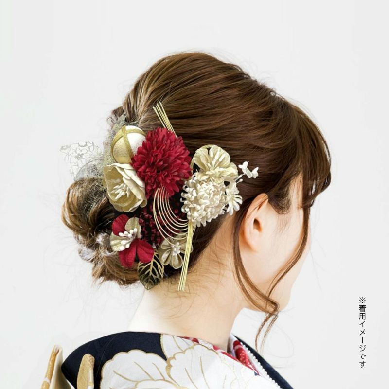 A.赤:深い赤の大マム、ゴールドのお花、ゴールド×白の玉飾りを組み合わせたUピン1点。深い赤の小マム、ゴールドのつまみのお花、赤×ゴールドのお花、ゴールドのメタルリーフのUピン1点。淡いベージュの小マム、ゴールドのお花、白の小花のUピン1点。ゴールドの八の字水引飾りのUピン1点。ゴールドのチュールレースのUピン1点。