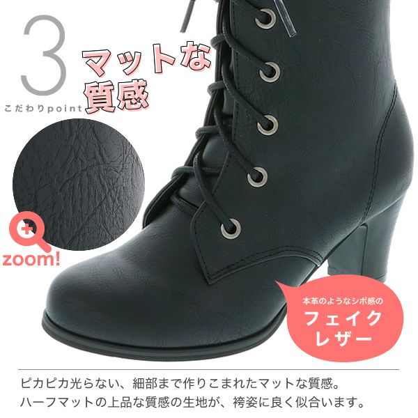 シンプルな黒色の編み上げブーツ(レースアップブーツ)です。