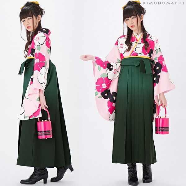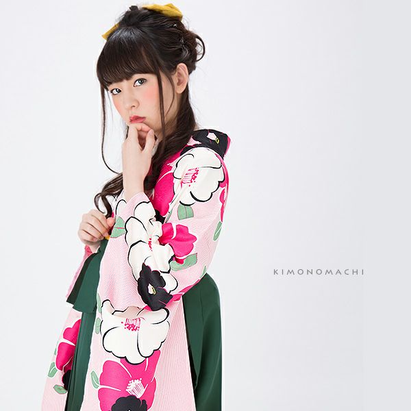 【カラー】着物は、紗綾形に花模様の地紋の入ったピンク×生成りみの白色のストライプ地に、黒、濃いピンク、生成りみの白色の椿のお花模様。袴は、緑色から暗く濃い緑色のぼかしのグラデーション。