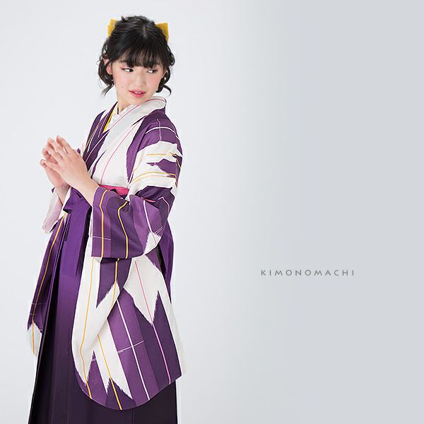 【カラー】着物は、紗綾形に花模様の地紋の入った生成りみの白色地に、濃淡の紫色の矢絣、縞模様。袴は、鮮やかな紫色から暗く濃い紫色のぼかしのグラデーション。