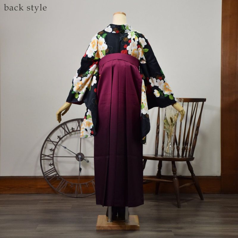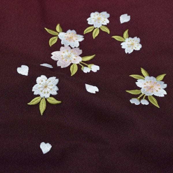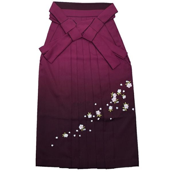 袴:少し暗めの赤紫色から暗く濃いエンジ色のぼかしのグラデーション。桜の刺繍