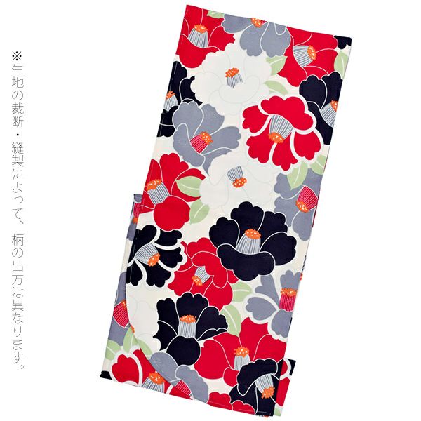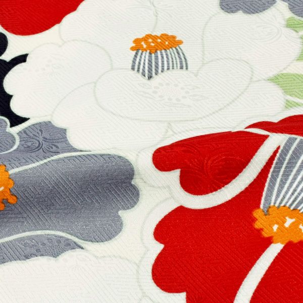 二尺袖着物:紗綾形に花の地紋のある生地です。ごく淡いクリーム色の地。赤、白、黒、淡いグレーの4色の椿の花。橙色の花芯、薄黄緑色の葉。たっぷりの花々で埋め尽くされた華やかさと、布の地紋が映えるシンプルな配色が魅力です。