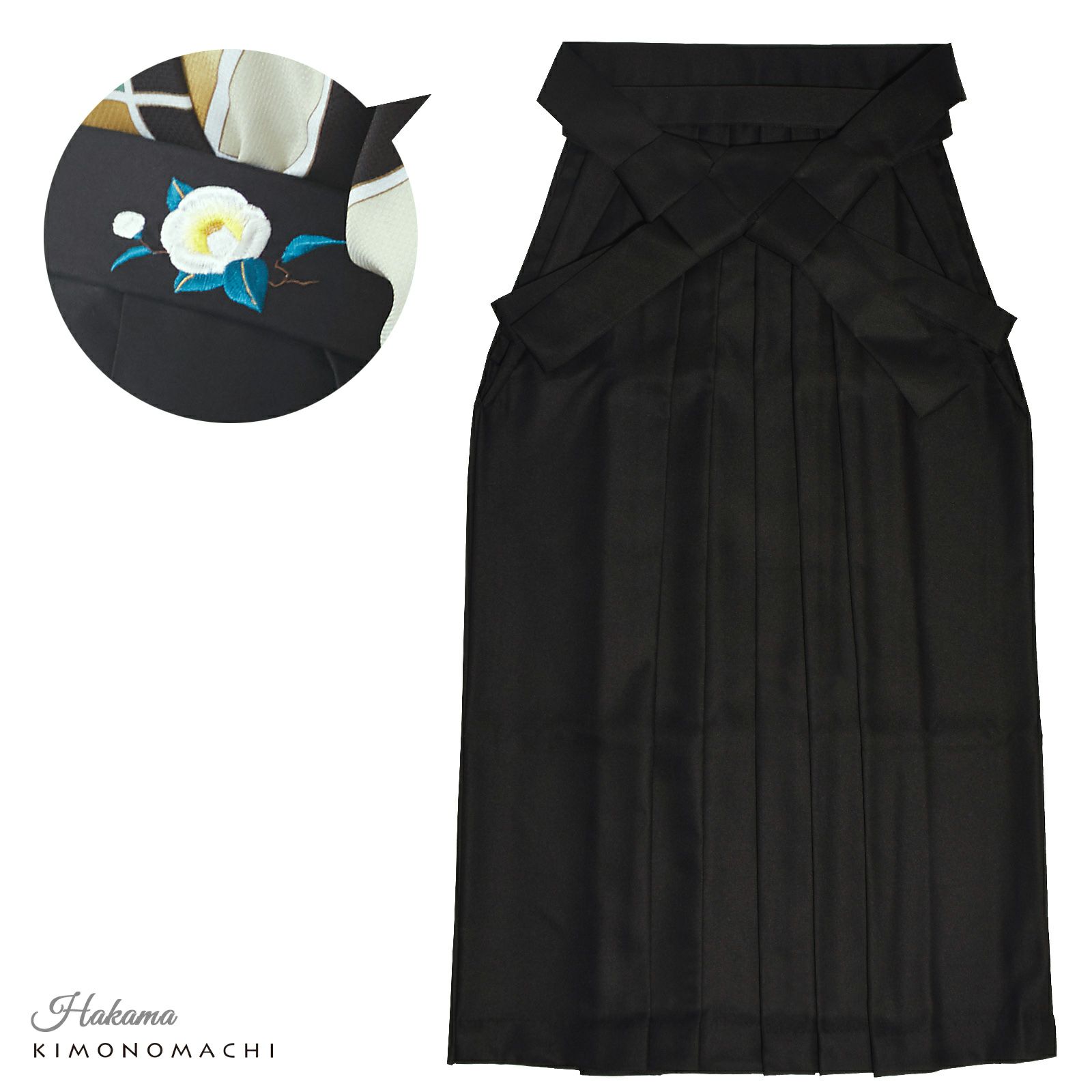 袴:黒地、腰の部分に白の椿の刺繍。
