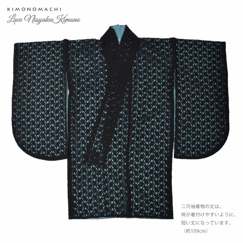 二尺袖着物:黒のエレガントなフラワーレースにターコイズブルーの色裏地を重ねた配色。色の対比がレースの優美さに鮮烈な印象を添えています。