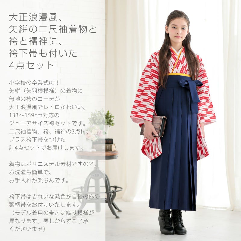 小学校の卒業式に!矢絣の着物に無地の袴のコーデが大正浪漫風でレトロかわいい、133~159cm対応のジュニアサイズ袴セットです。