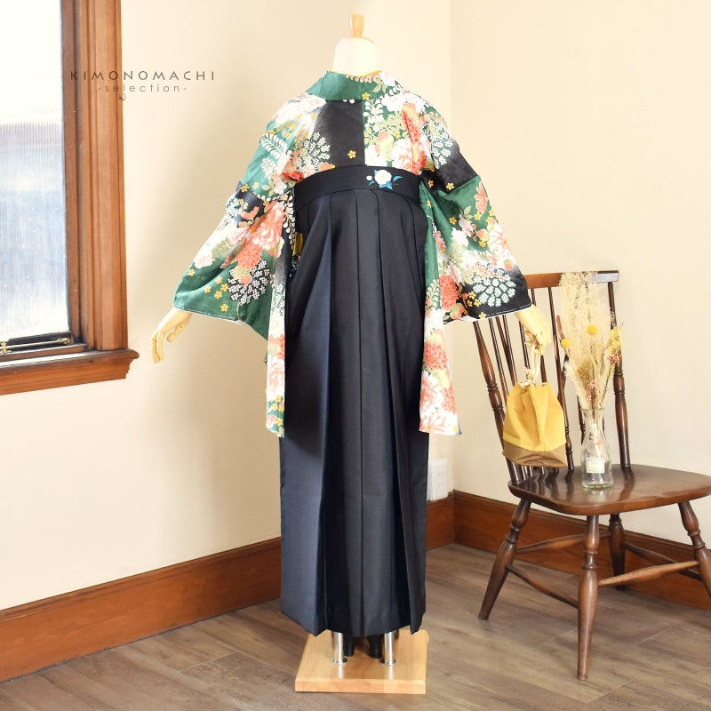 5. 袴 セット 卒業式 女性 4点セット「二尺袖:緑黒ボカシ地 菊に藤+袴:黒 椿の刺繍+袴下帯:イエロー 麻の葉+襦袢」レディース 袴セット 二尺袖着物セット 着物 卒業 二尺袖 袴【メール便不可】