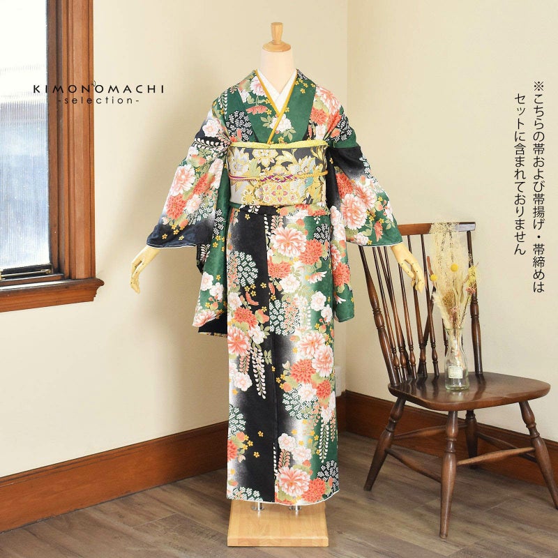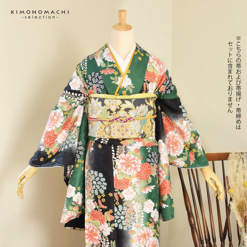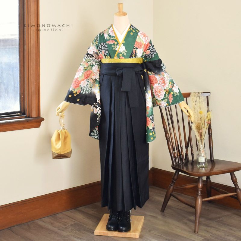 卒業式に 二尺袖袴セット 卒業式 袴 レディース 袴 セット 卒業式 女性 4点セット「二尺袖:緑黒ボカシ地 菊に藤+袴:黒 椿の刺繍+袴下帯:イエロー 麻の葉+襦袢」レディース 袴セット 二尺袖着物セット 着物 卒業 二尺袖 袴【メール便不可】