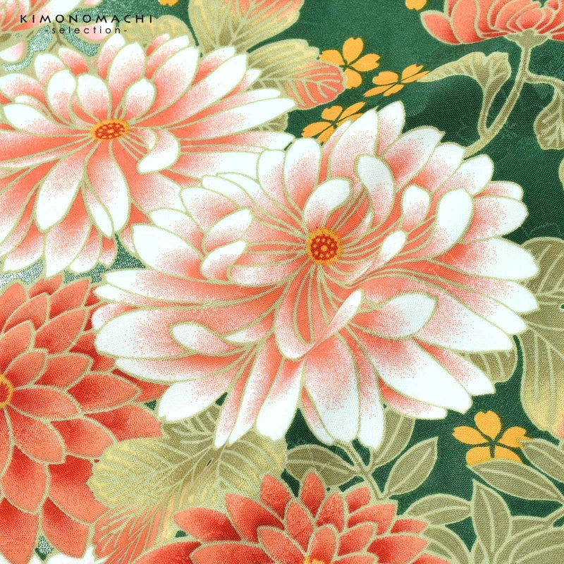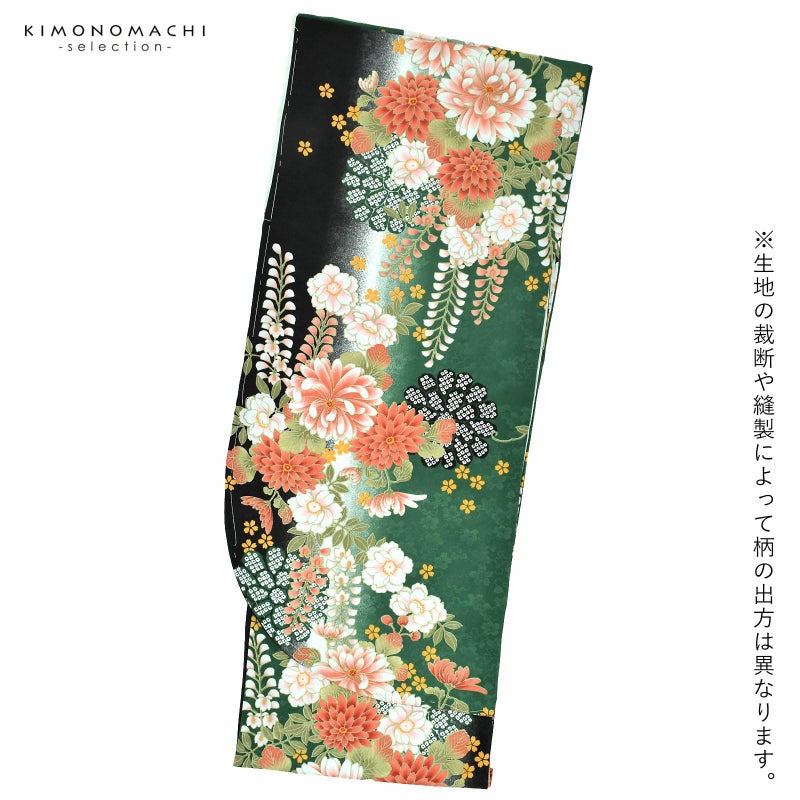 二尺袖着物:桜の地紋のある生地です。深い緑色と黒の縦ぼかしの地に、サーモンピンクやコーラルレッドの菊に藤、淡いピンクの八重桜を組み合わせた文様。浅い緑の葉、山吹色の小桜が散らされています。華やかさと古典的な格調高さを感じる着物です。