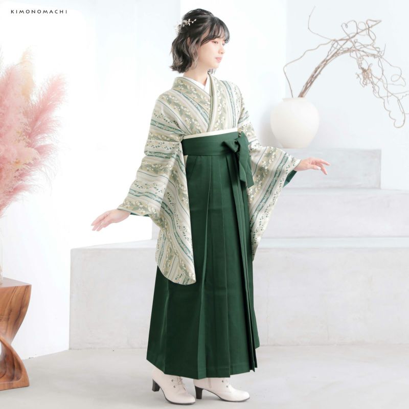 袴はシンプルな単色。行灯袴(あんどんはかま)で中仕切りのないスカートタイプ。草履はもちろん、ブーツを合わせたモダンな着こなしにも。生地はお手入れしやすいポリエステル素材です。