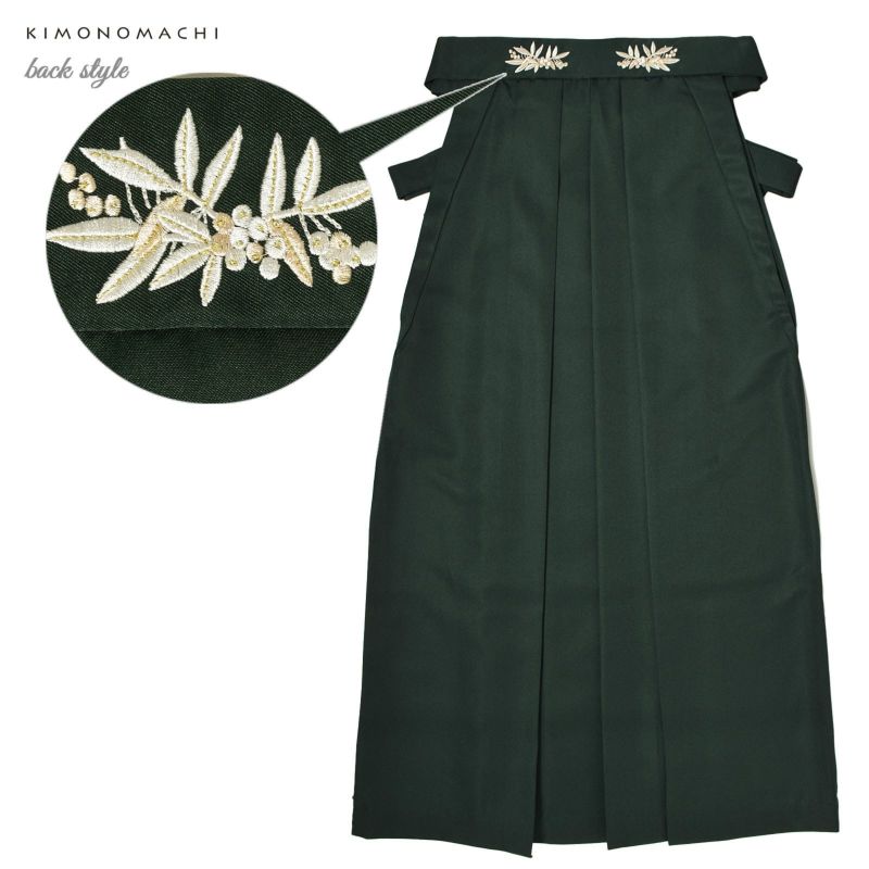袴:やや暗い深緑色の地、腰の後ろ部分にシルバーグレーやグレージュ、ポイントに金糸の入った南天の刺繍。