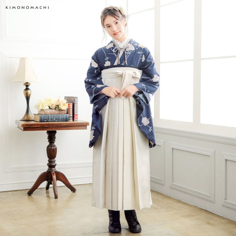袴 セット 卒業式 女性 4点セット「二尺袖:ばら墨紺色+袴:オフホワイト 葡萄+袴下帯:黒 麻の葉+襦袢」卒業式 女性 レディース お仕立て上がり 袴セット 二尺袖着物セット 着物 二尺着物 袴【メール便不可】