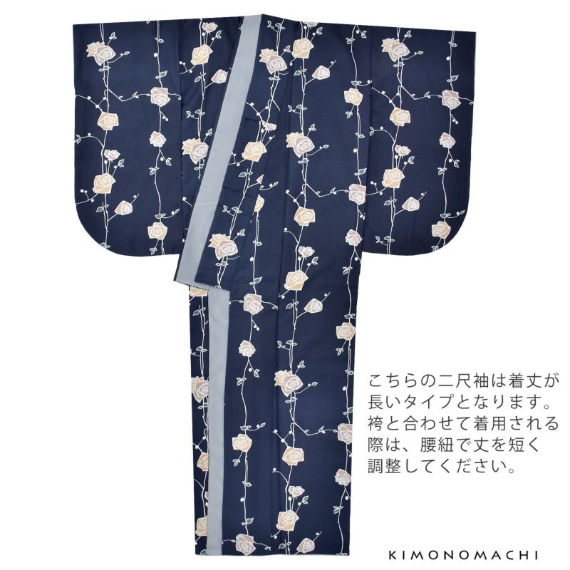 二尺袖着物:細かな地模様のある生地。灰みの紺地に、ごく淡いグレーの輪郭線、ベージュやグレージュの花、深い青緑の葉のバラの花。やや直線的なデザインが現代的な中に懐かしさを感じさせます。裏地はグレー。